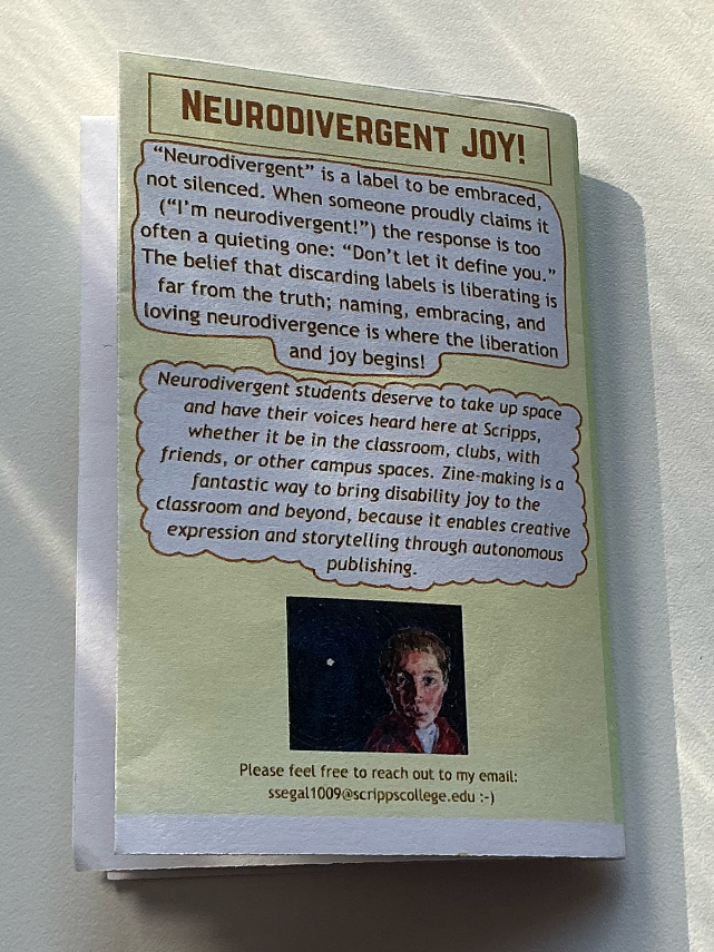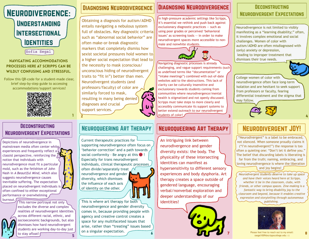 On our website, you will be able to see the zine in digital format – the QR code on page one leads to a step-by-step guide to navigating accommodations processes here at Scripps. It is especially important at a women’s college to make sure these processes are not overlooked (as, unfortunately, they are all too often dismissed, evidenced through broken links on existing disability service websites, insensitive language, and more), as neurodivergent experiences and spaces are already highly gendered [see the content of the zine to learn more!]. Neurodivergent women, especially women of color, are too often expected to advocate for every need on their own; thus, Scripps college needs a stronger foundation of mutual support, respect, and understanding. I encourage you to read each dense little page of the zine to learn more – if anyone would like to continue the feminist conversation around neurodivergence, please feel free to reach out to my email: ssegal1009@scrippscollege.edu!
