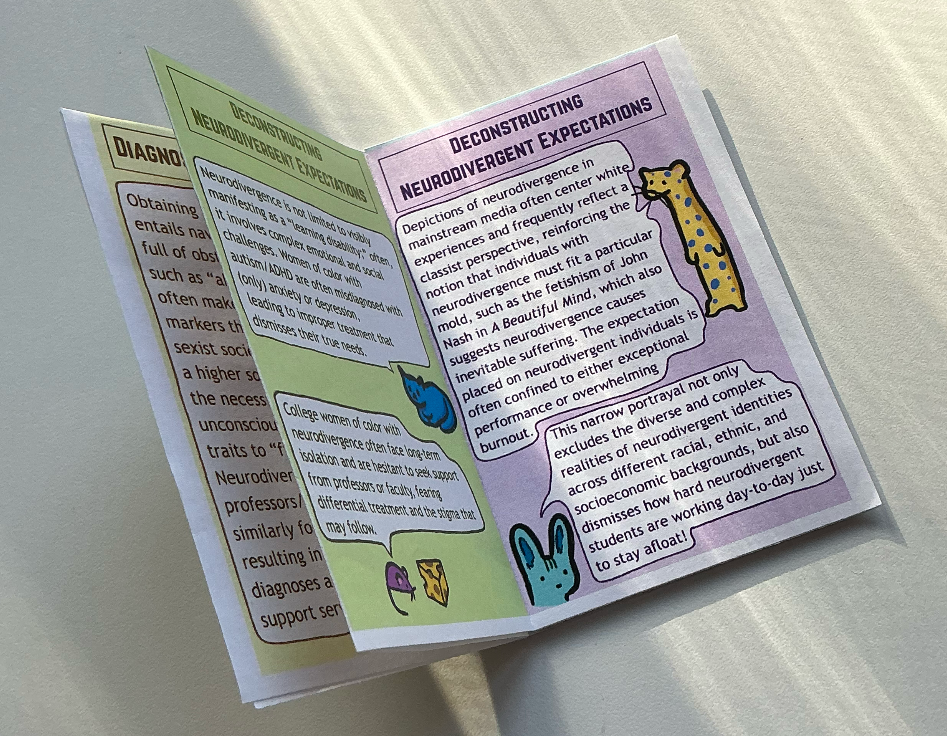 Neurodivergence, gender, race, sexuality, and class often get clinically and therapeutically treated as separate identity axes; thus, in my mini-zine, I am seeking to fill in the gaps of knowledge surrounding the intersectionality of neurodivergence. Whether it be neurodivergent or neurotypical students and professors, parents, siblings, friends, or administrators of Scripps reading my work, my goal is to give depth to our collective understanding of the neurodivergent identity. I am striving to go beyond the reduction of the singular label “neurodivergence” by highlighting myriad interactions that mold each neurodivergent person’s unique experiences.